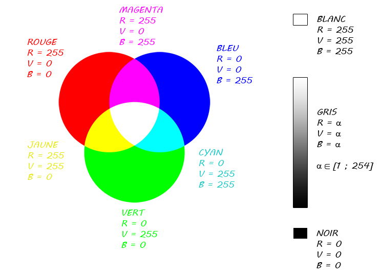 À noter qu'une couleur dont les 3 composantes sont identiques correspond à un niveau de gris.