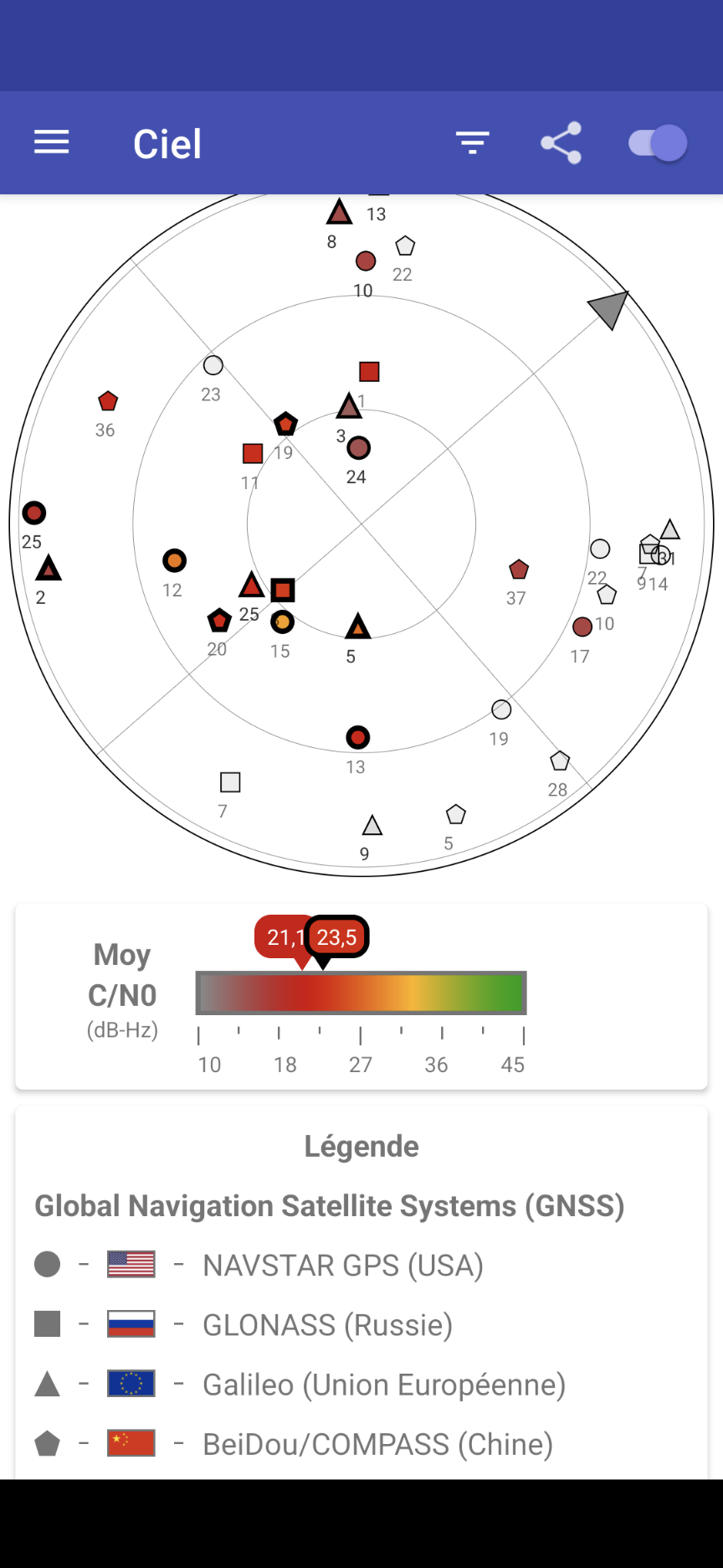 L'application GPSTest (entre autres) permet de lister les satellites dont les messages sont reçus par le smartphone et de voir à quel service ils appartiennent. Ici, on peut voir que le téléphone capte les messages de 4 flottes de satellites :
